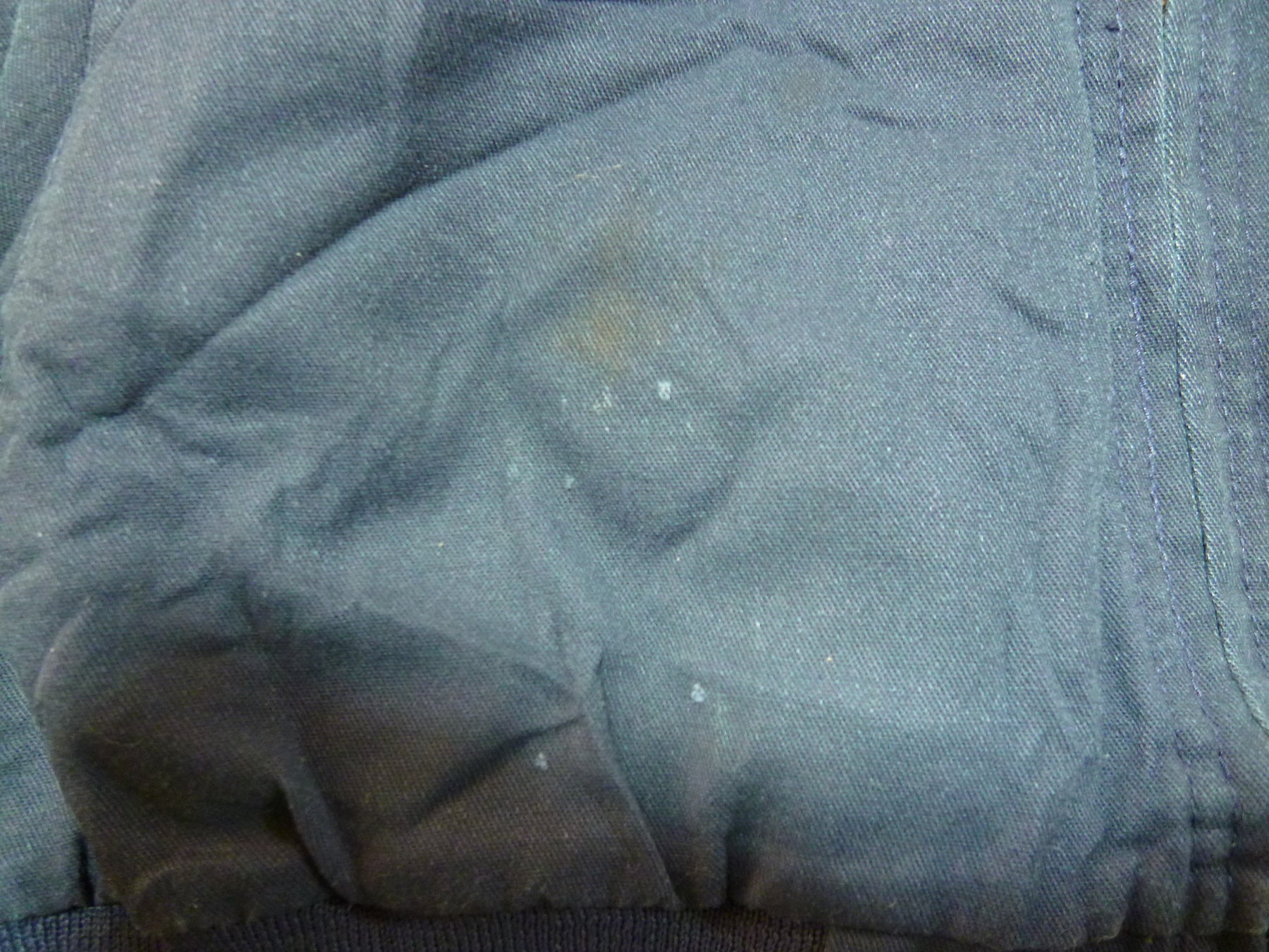 前面のファスナーより右側の裾付近に白い汚れ複数と茶色いっぽい汚れ有り シワあり